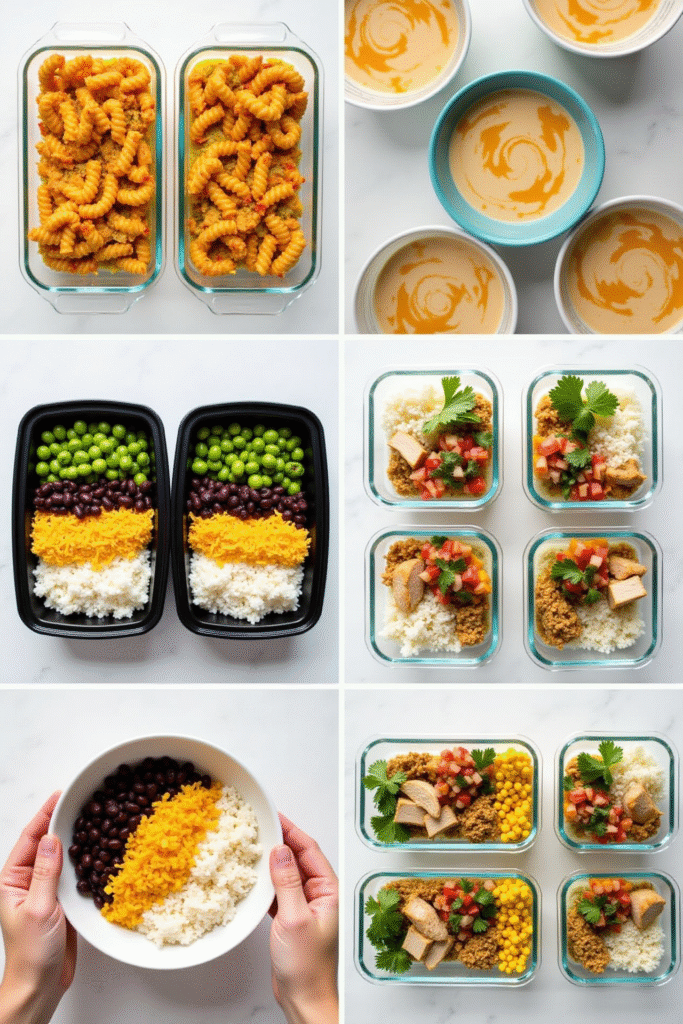 - Assemble all bowl components: layer rice, black beans, corn, tomatoes, onion, and greens in your meal prep container.