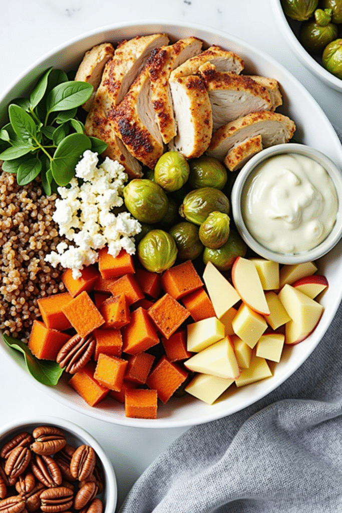 - Assemble Bowls: Divide rice, kale, sweet potatoes, and grilled chicken between four bowls. Top each with diced apples, goat cheese, and almonds.
